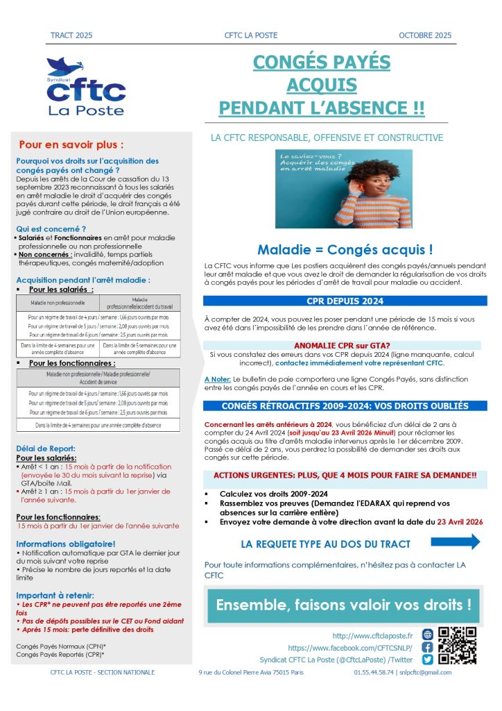 La CFTC vous informe que Les postiers acquièrent des congés payés/annuels pendant leur arrêt maladie et que vous avez le droit de demander la régularisation de vos droits à congés payés pour les périodes d’arrêt de travail pour maladie ou accident.
