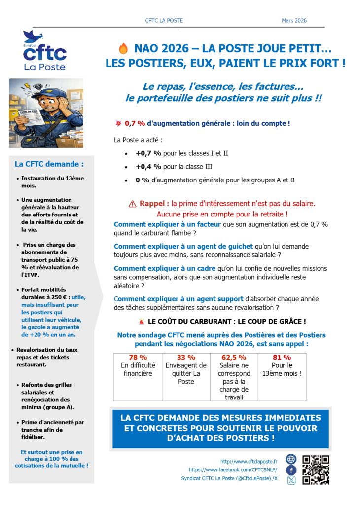 Notre sondage CFTC mené auprès des Postières et des Postiers pendant les négociations NAO 2026, est sans appel :